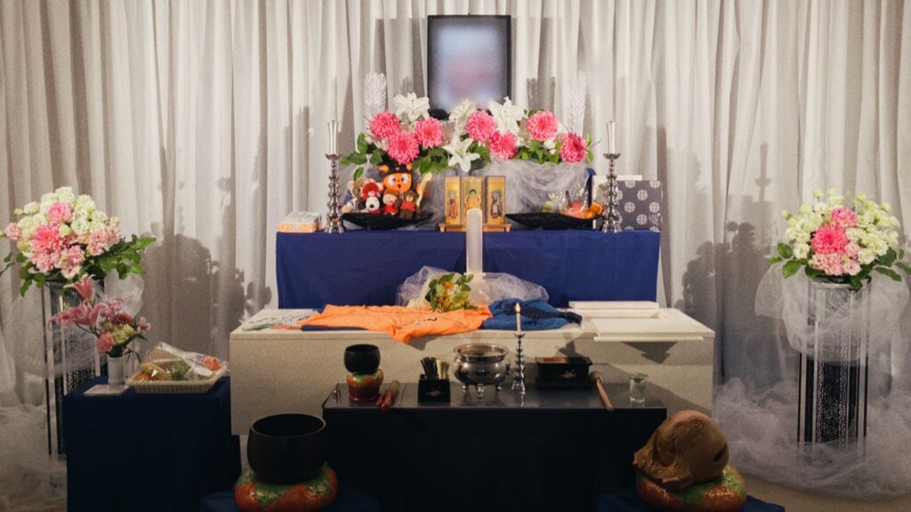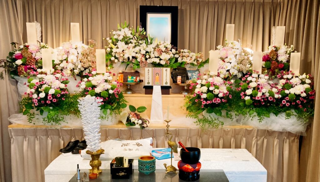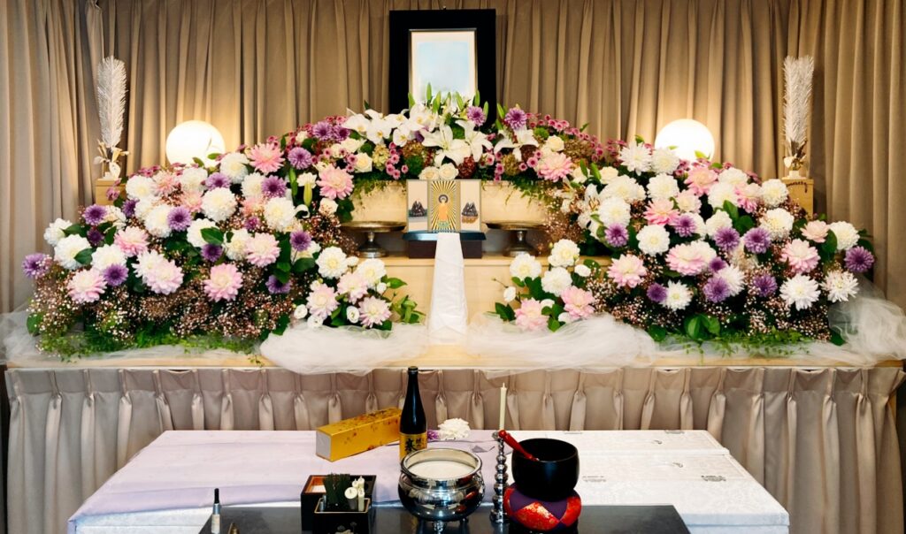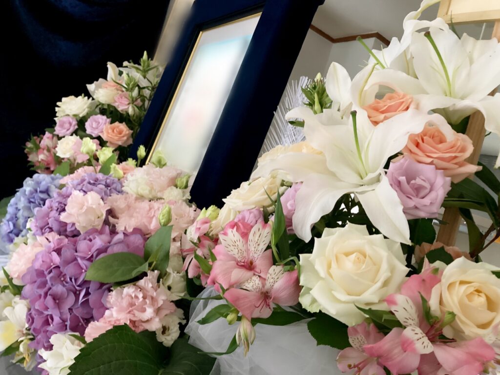 たくさんの種類のお花を使用した花祭壇【アジサイ・ユリ・アルストロメリア】