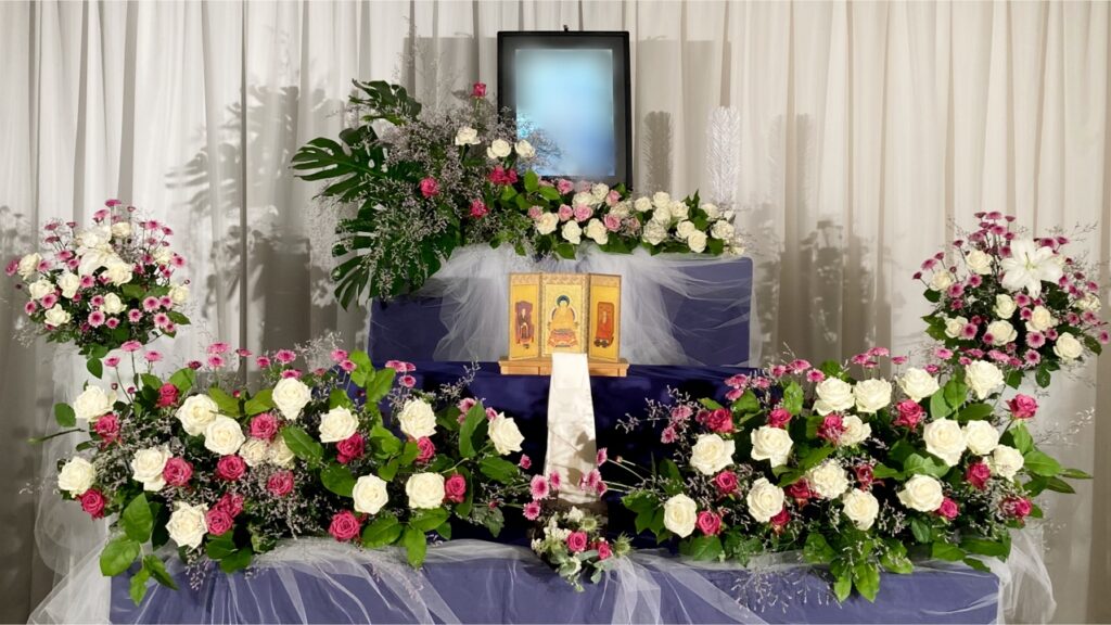 シックな雰囲気の花祭壇【ダリア・バラ・カーネーション】
