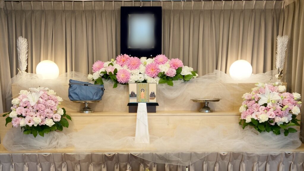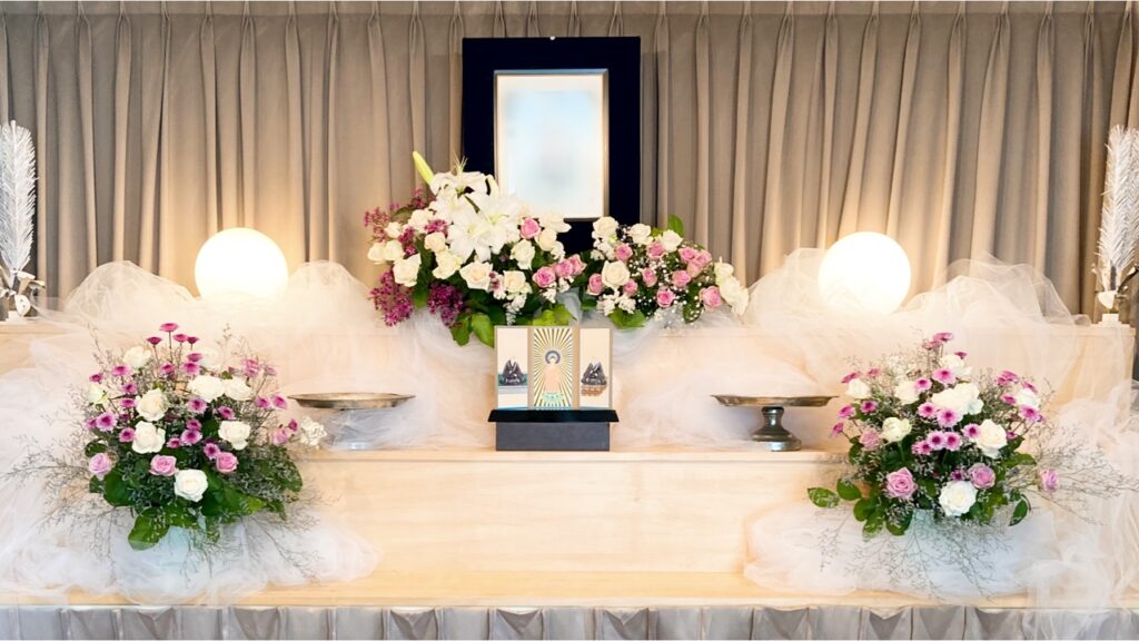 白と淡いピンクの花祭壇【ダリア・アナスタシア・アイシャ】