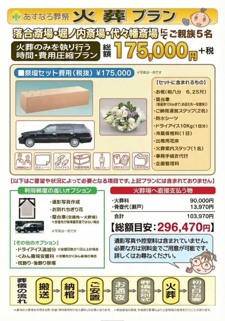 2. 「火葬料・骨壺コミコミ」あすなろ葬祭の誠実直葬プラン
