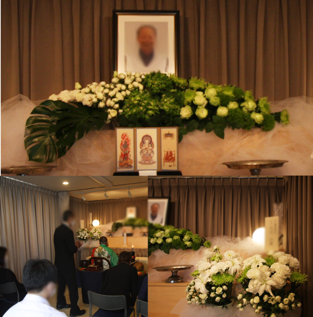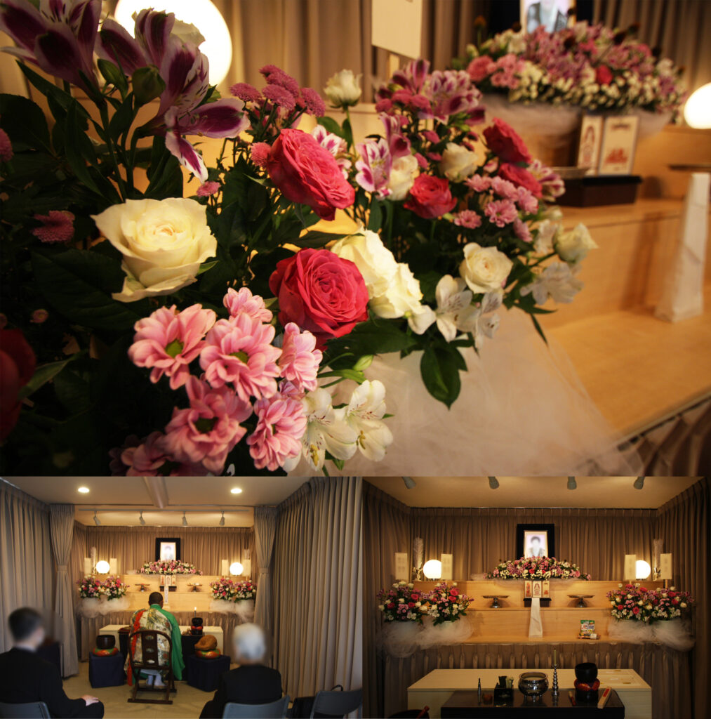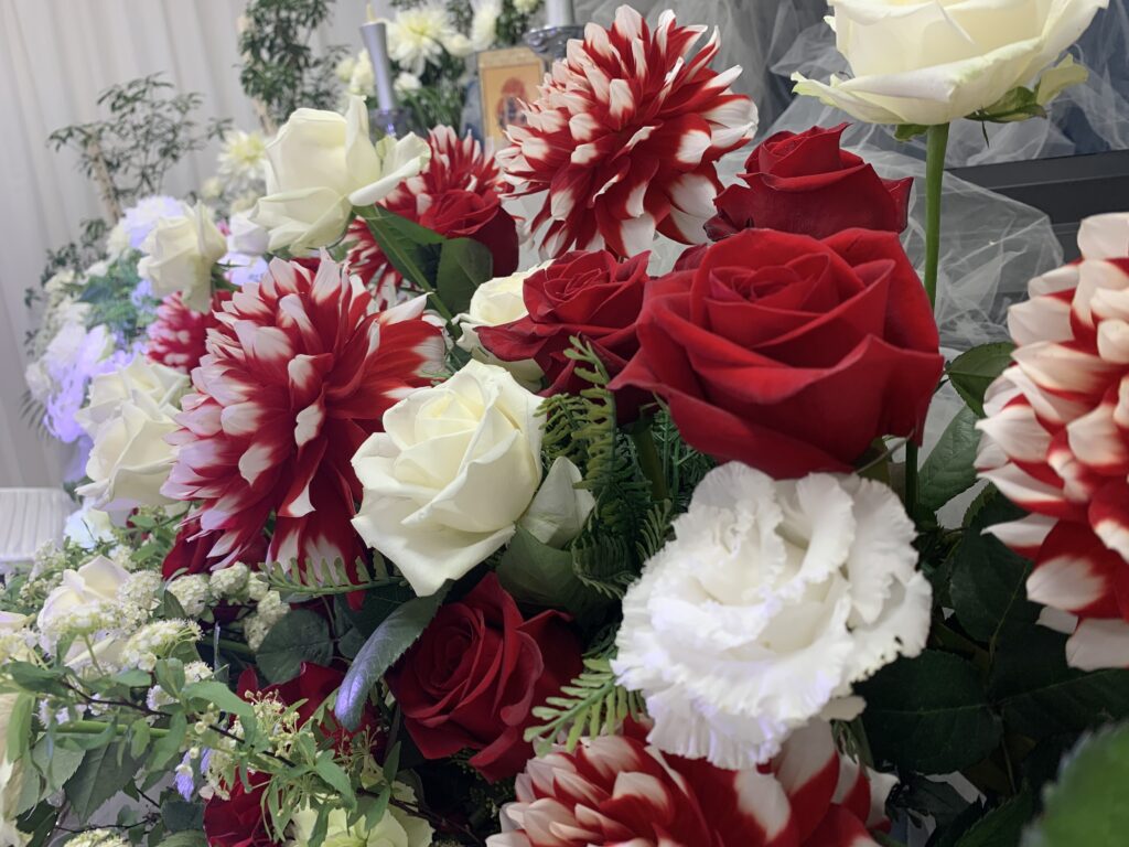 シックな雰囲気の花祭壇【ダリア・バラ・カーネーション】