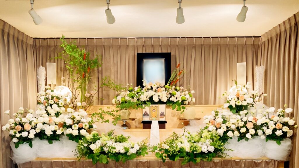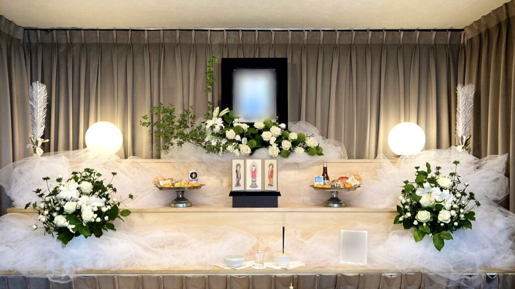 真っ白な花祭壇【ダリア・洋キク・ユリ】