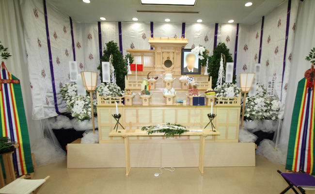 神道祭壇正面 中野区の東部にお住まいの方を神式(神道)の葬儀で落合斎場にておくるお手伝いをいたしました。   神式(神道)でおくるお葬式は葬儀全体の5%に満たないくらいの割合で、お葬式をするときには圧倒的に仏教が多くなっております。また、当社で神式(神道)の葬儀は1年間で2〜4件位お手伝いする事があります。   私が葬儀業界に入りたての頃には神式(神道)の葬儀の受注があると過去の写真やノートを引っ張り出して予習復習をするほどの苦手意識がありましたが、現在では神鐉物(神様へのお供え物)の盛り付けをするのにいかに綺麗に見えるかなど工夫をしながらテキパキと準備や葬儀の進行が行えるレベルになりました。   神式(神道)で葬儀をする際の葬儀社選びとして、神式(神道)の葬儀に苦手意識を持っている葬儀担当者や葬儀社がおりますので、相談をしながら神式(神道)に詳しいか詳しくないか見極める必要があります。     落合斎場で親族10名、近所の方40名で行う神式(神道)のお葬式は、式場料や火葬料、飲食代、香典返しなど葬儀に関わる物(祭主への謝礼は除く)全て含んで140万円で執り行う事が出来ます。 大榊 写真右上:大榊 写真中上:五色旗と三種の神器(鏡と曲玉) 写真左上:五色旗と三種の神器(刀) あすなろ葬祭では神式(神道)のお葬式をお手伝いしております。事前の見積や生前相談も承りますのでお困りの事がありましたら下記電話番号にお電話下さい。